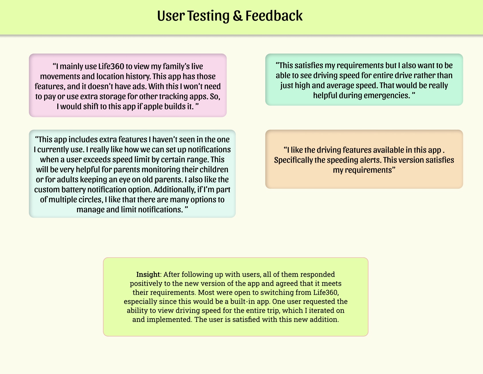 • One user suggested the ability to view driving speed for the entire trip, which was implemented in a later iteration.