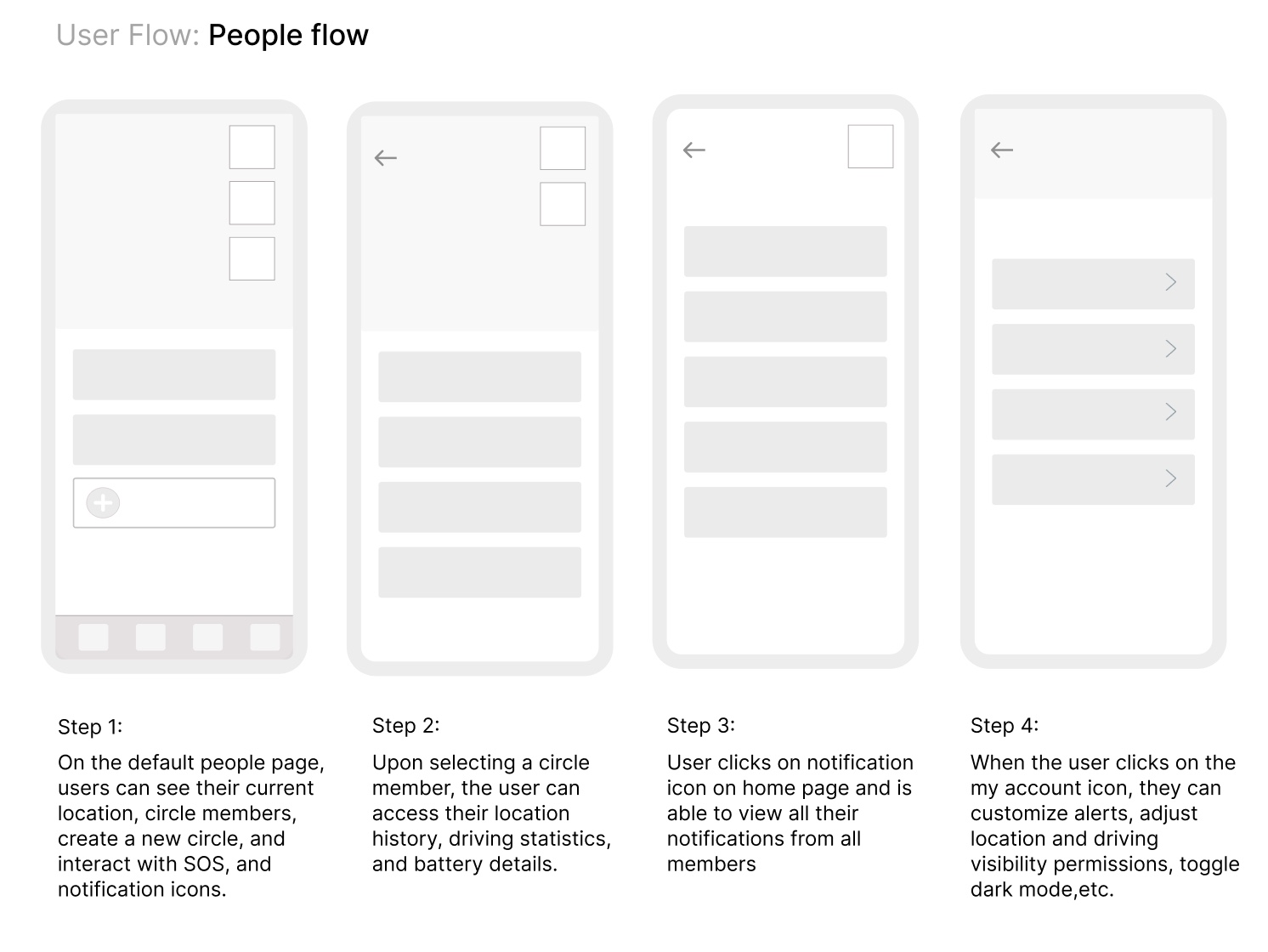 • People View Screen (circle, location, SOS, notifications)