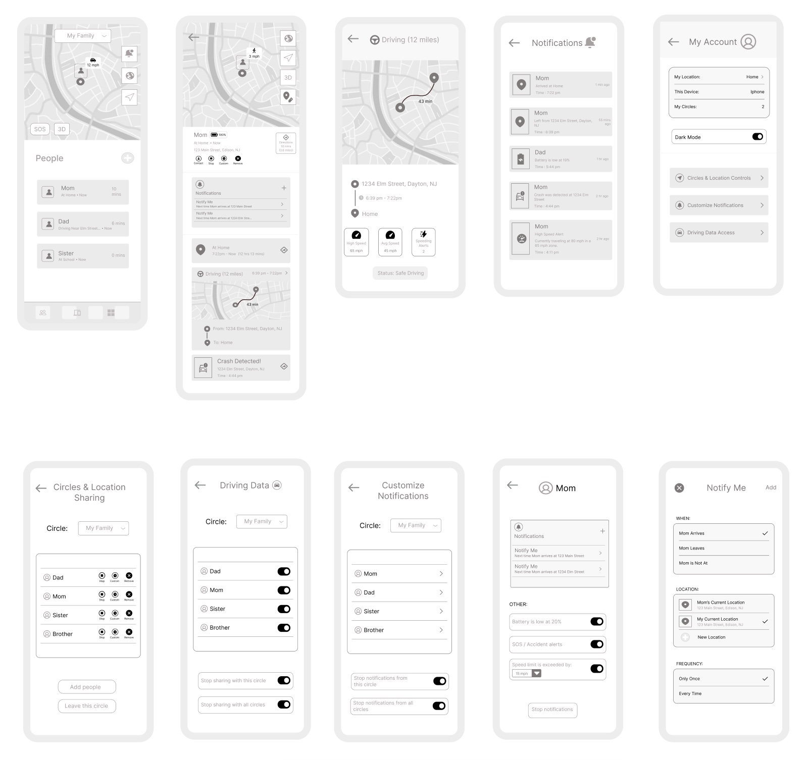 The prototype above highlights the member (Mom) flow screens and demonstrates the various features available, including location history, notifications, driving statistics, and more.