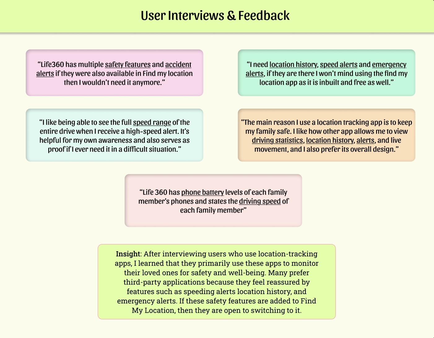 Through personal experience and research, I discovered that many iPhone users rely on third-party tracking apps such as Life360 instead of Find My, despite already being in the Apple ecosystem. I wanted to understand why users preferred external apps and whether Find My could evolve to meet those expectations.