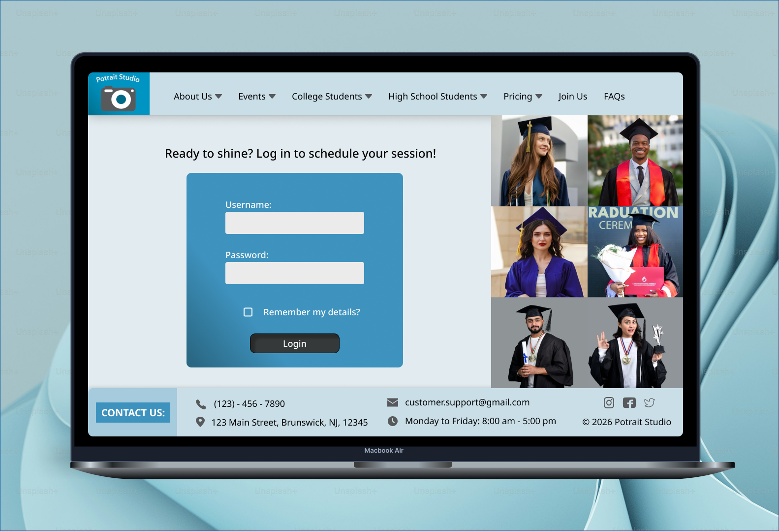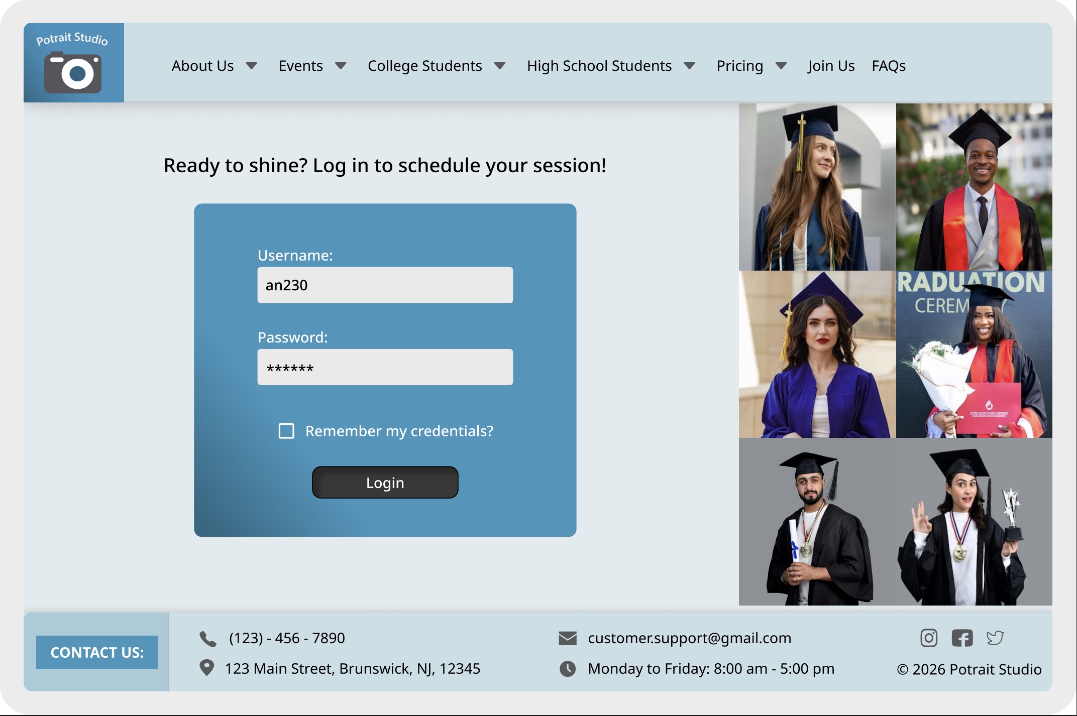 Changes made: Created a new logo/name using Adobe, added a header and footer to highlight key company information, incorporated graduation imagery, enhanced the visual design using brand colors, and introduced a “remember my credentials” option for future convenience.