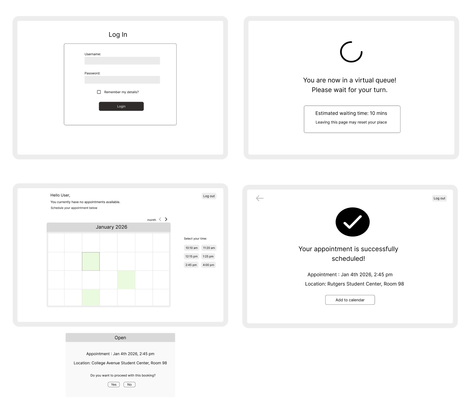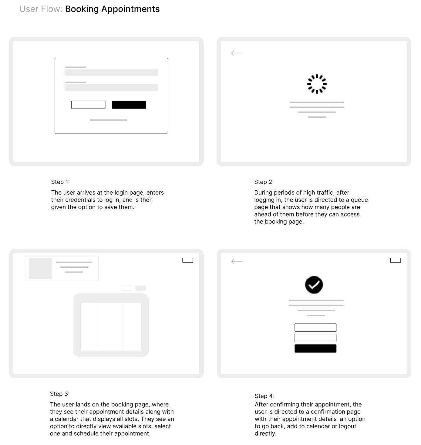 I started by mapping the full booking experience, from logging in to receiving the appointment confirmation.